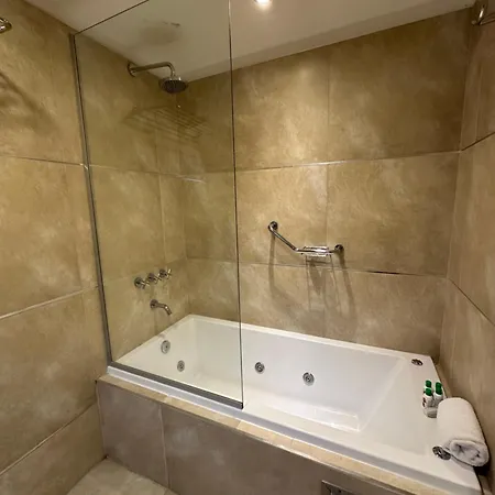 The apartment includes a balcony and a dressing room, complete with a sofa set and a work desk and modern conveniences such as a TV. Featuring a bidet, a separate toilet, and a bath, a bathroom is also fitted with a hair dryer and bath sheets.